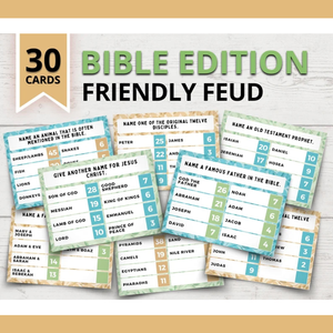This printable Bible Feud set includes 30 thought-provoking questions that challenge playersβ Bible knowledge while keeping the mood light and engaging. Designed to be easy to set up and play, itβs ideal for teachers, ministry leaders, and families who want to make learning Scripture exciting and fun for all ages.